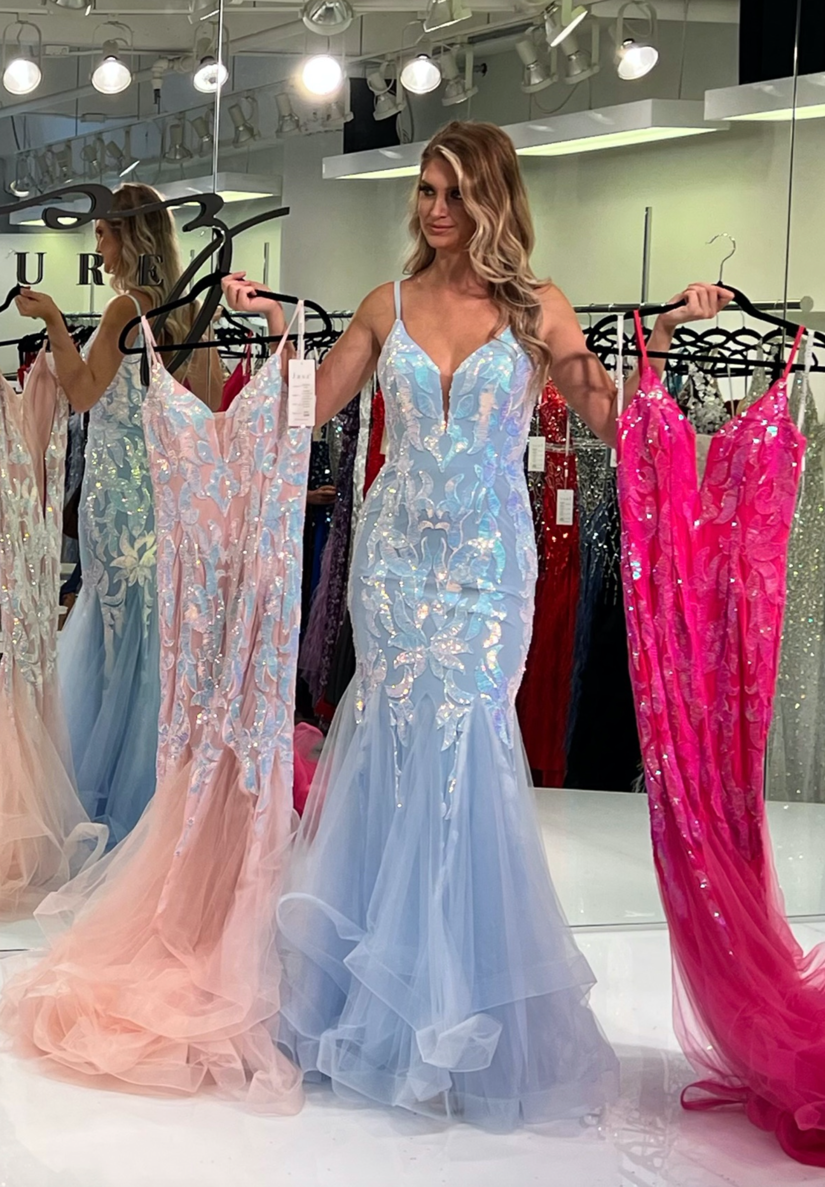Shop Lavender Formals for your next event! This beautiful hand made gown is used with stunning fabric and embellishments. Need help finding your size? Text STYLIST to 9255426101 and we will help you find the perfect dress.