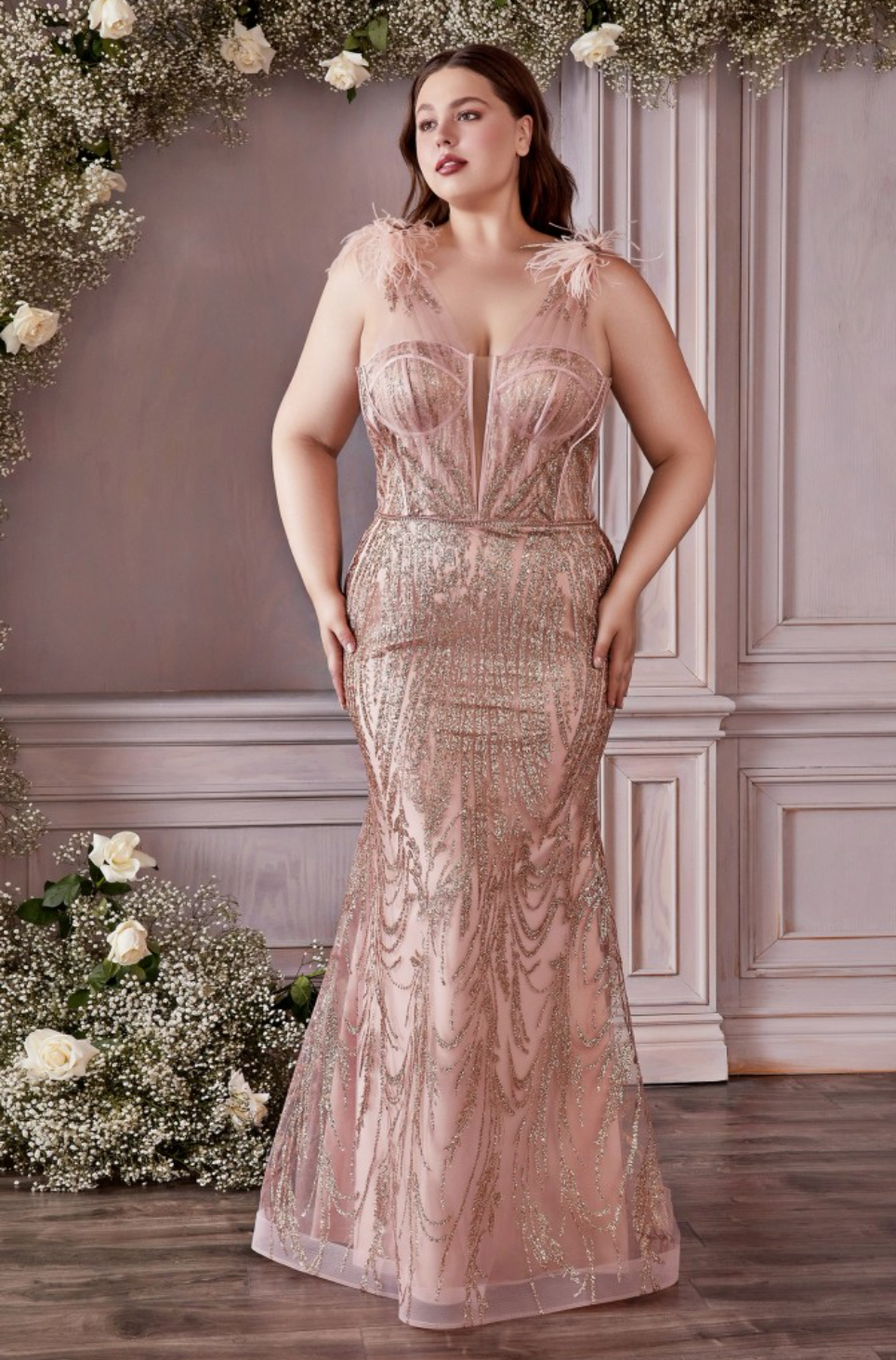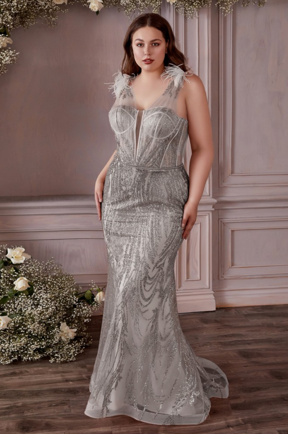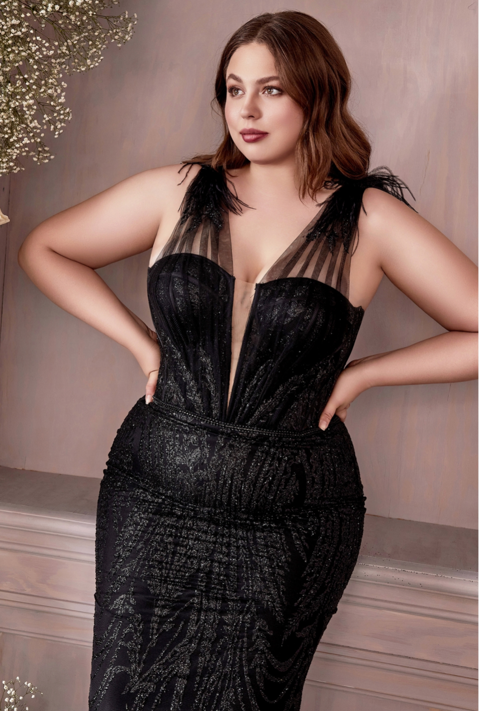 Equally regal and glamorous, this statement piece has a glitter lace pattern outlining and contouring the fitted figure. The structured bodice has a bust cup outline and sheer illusion tulle wrapping around the chest and onto delicate straps topped with a dainty feather detail.