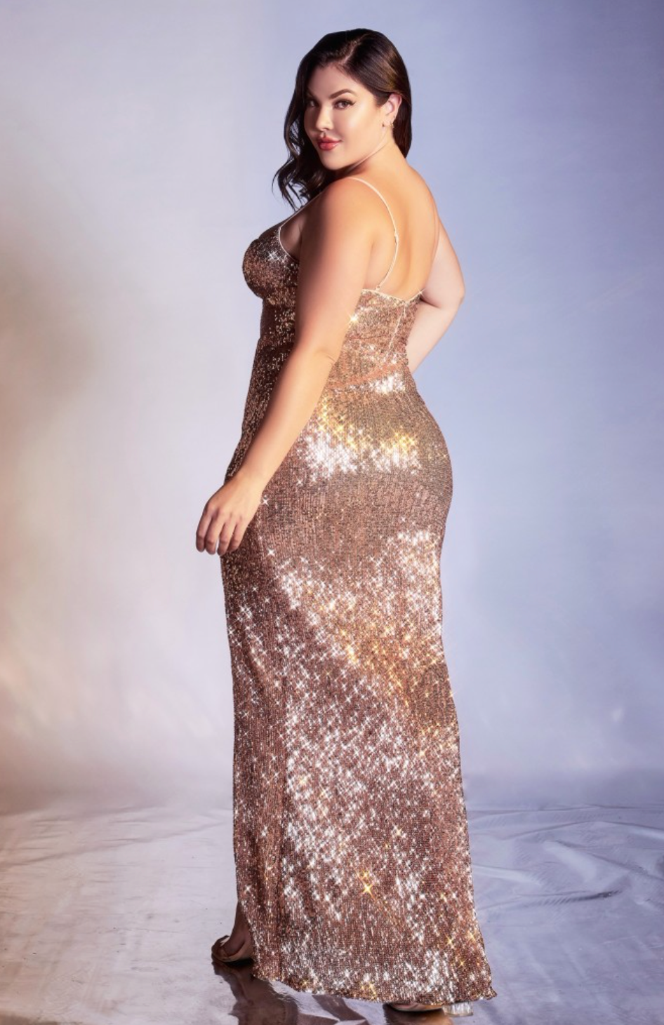 This glittering sequin-encrusted column gown features a modern sweetheart neckline, a banded waist, and a front split that flashes just the right amount of leg as you walk. The bodice is piped in jersey, acting as a barrier between the sequins and your skin to ensure ultimate comfortability while adjustable spaghetti straps guarantee the perfect fit.