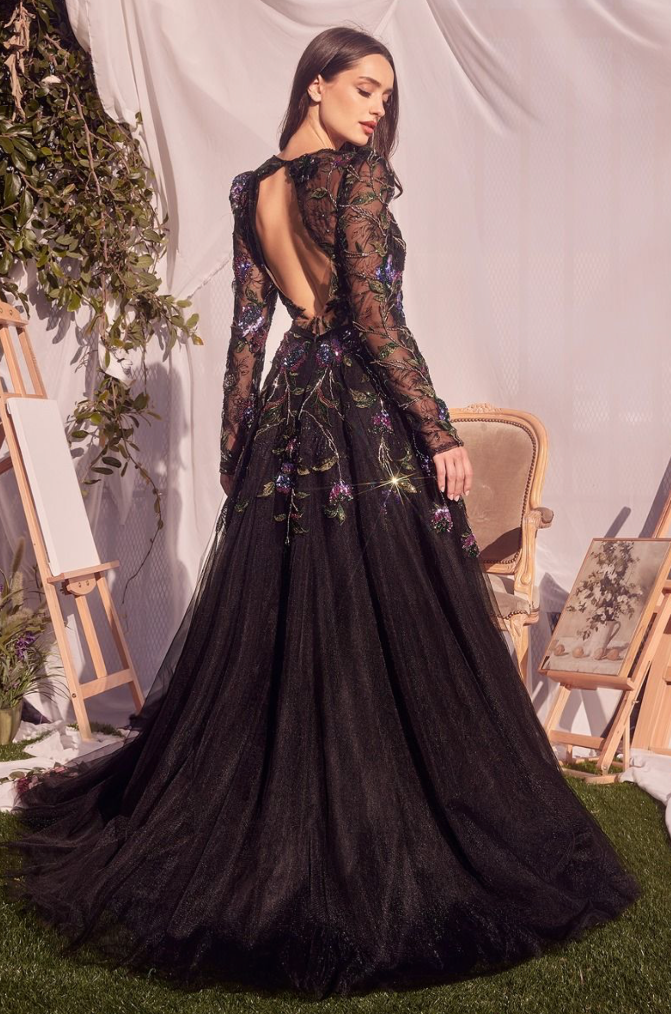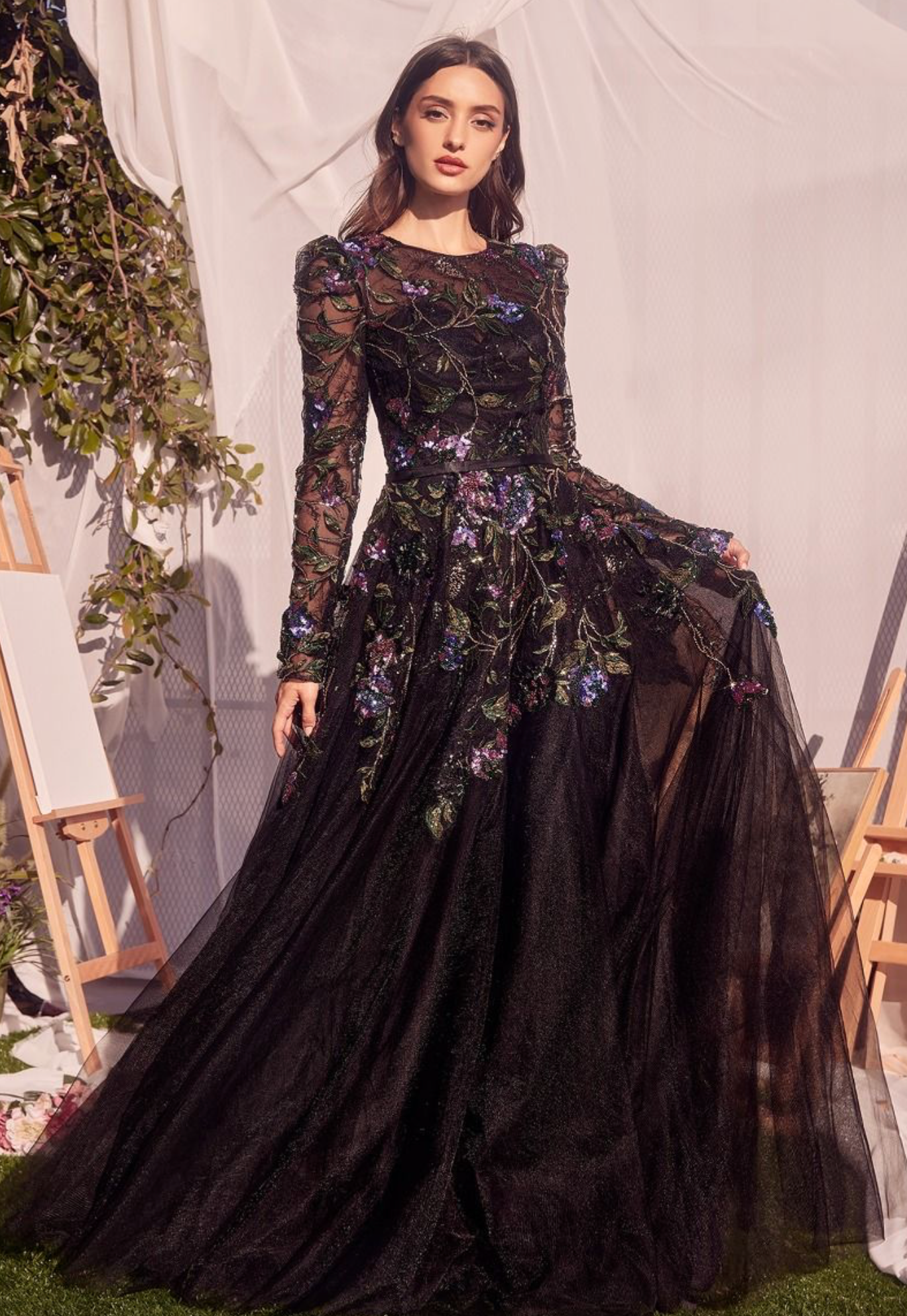 Make a stunning impression in this exquisite ball gown featuring a high neckline and long sleeves, elegantly complemented by an open keyhole back. Crafted from layered tulle adorned with scattered colorful floral appliques, this dress beautifully blends sophistication with a touch of whimsy. The fitted bodice and flowing A-line skirt create a graceful silhouette, making it perfect for the mother of the bride, galas, or any formal event.