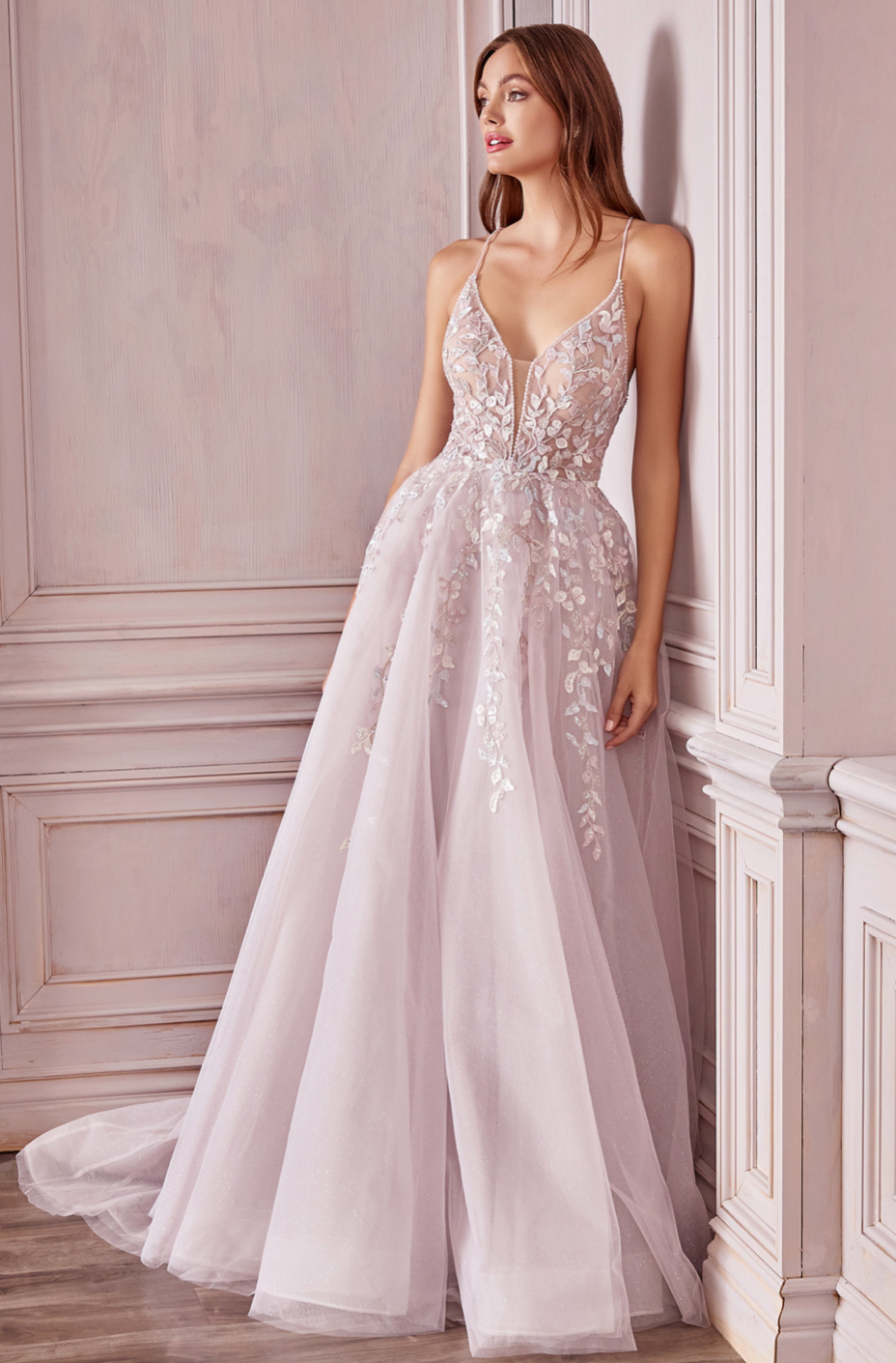 Step into a secret garden in this A-line layered tulle gown with floral leaf applique. Soft hues of pastel leaves with shimmering crystals dance down soft, shimmering layers of lt. mauve tulle. The unlined bodice features deep plunging V-neckline framed with iridescent beading and adjustable lace up corset back. Full, floaty skirt is soft and weightless, leaving whispers in your steps.