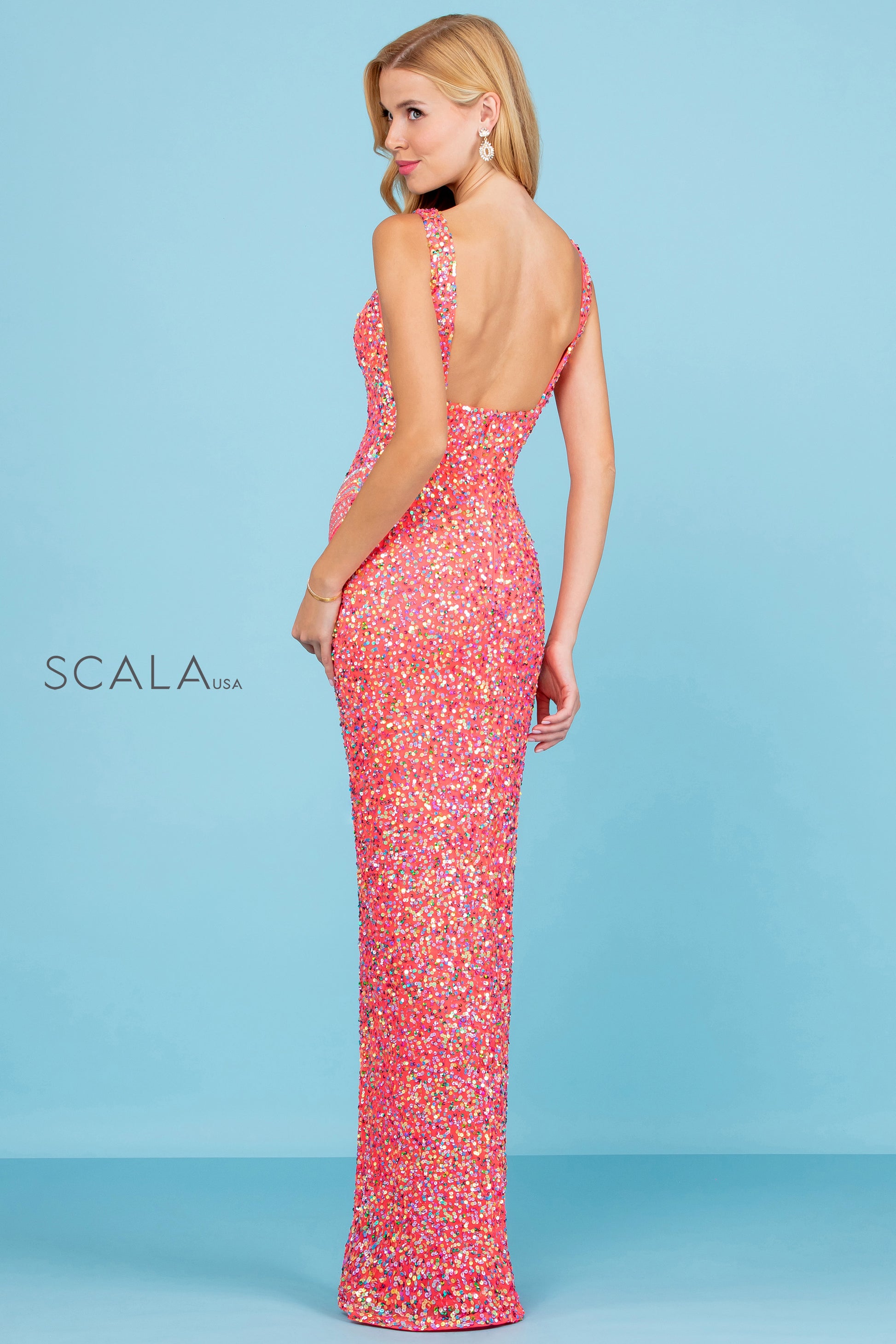 Look stunning in this beautiful and embellished gown that is very detailed. One of the details include a high slit, with added fringe. This gown is one of a kind and will be the look of the night! This SCALA USA gown comes in variety of sizes and colors- calypso, ivory, red, and turquoise. Need help looking for the perfect size? Contact a stylist today and we will help you find the perfect fit!