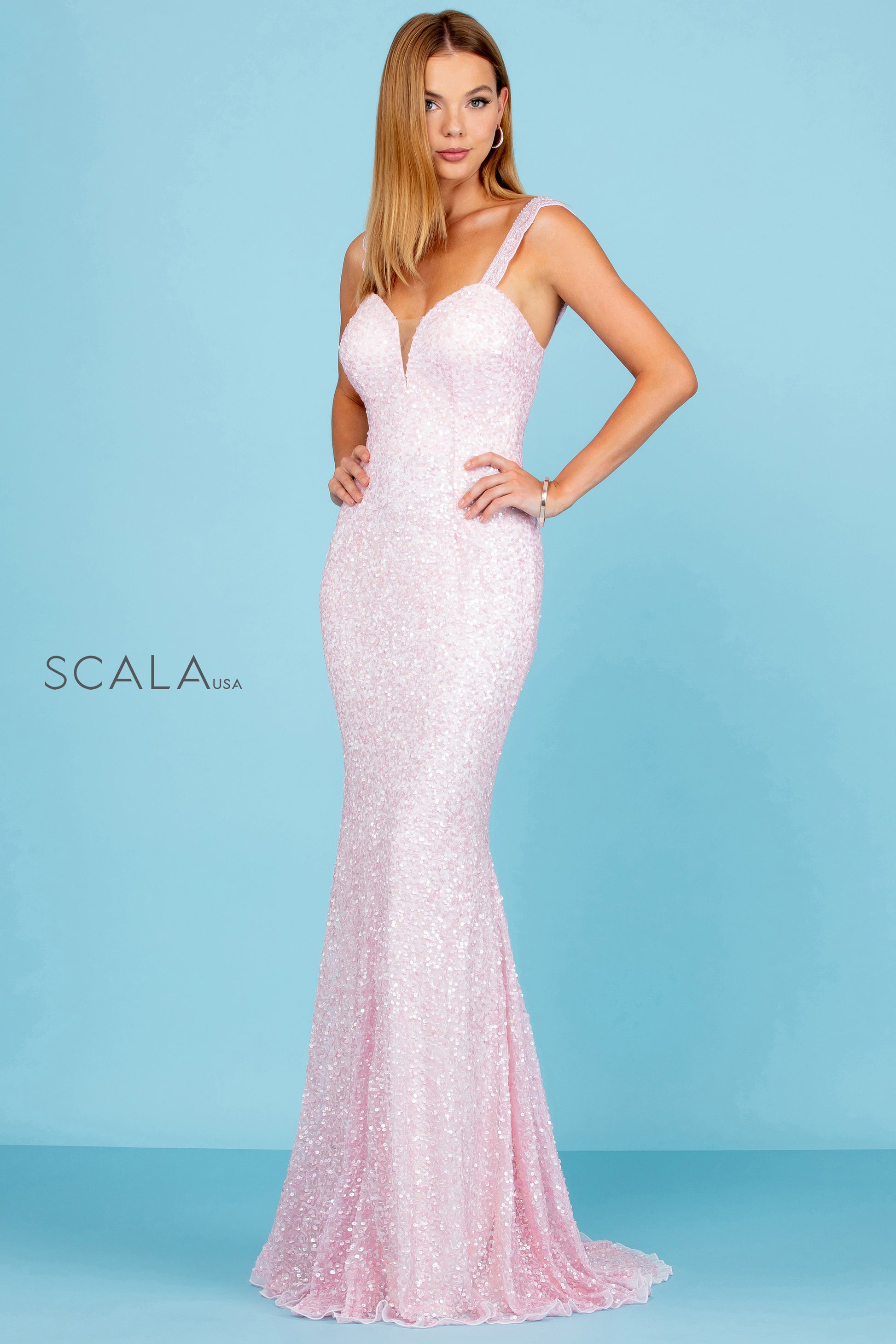 This beautiful sweetheart neckline with short sleeves is super comfortable and elegant. Handmade beading and sequin makes this gown the star of the night. This SCALA USA gown comes in variety of sizes and colors- black, and petal. Need help looking for the perfect size? Contact a stylist today and we will help you find the perfect fit!