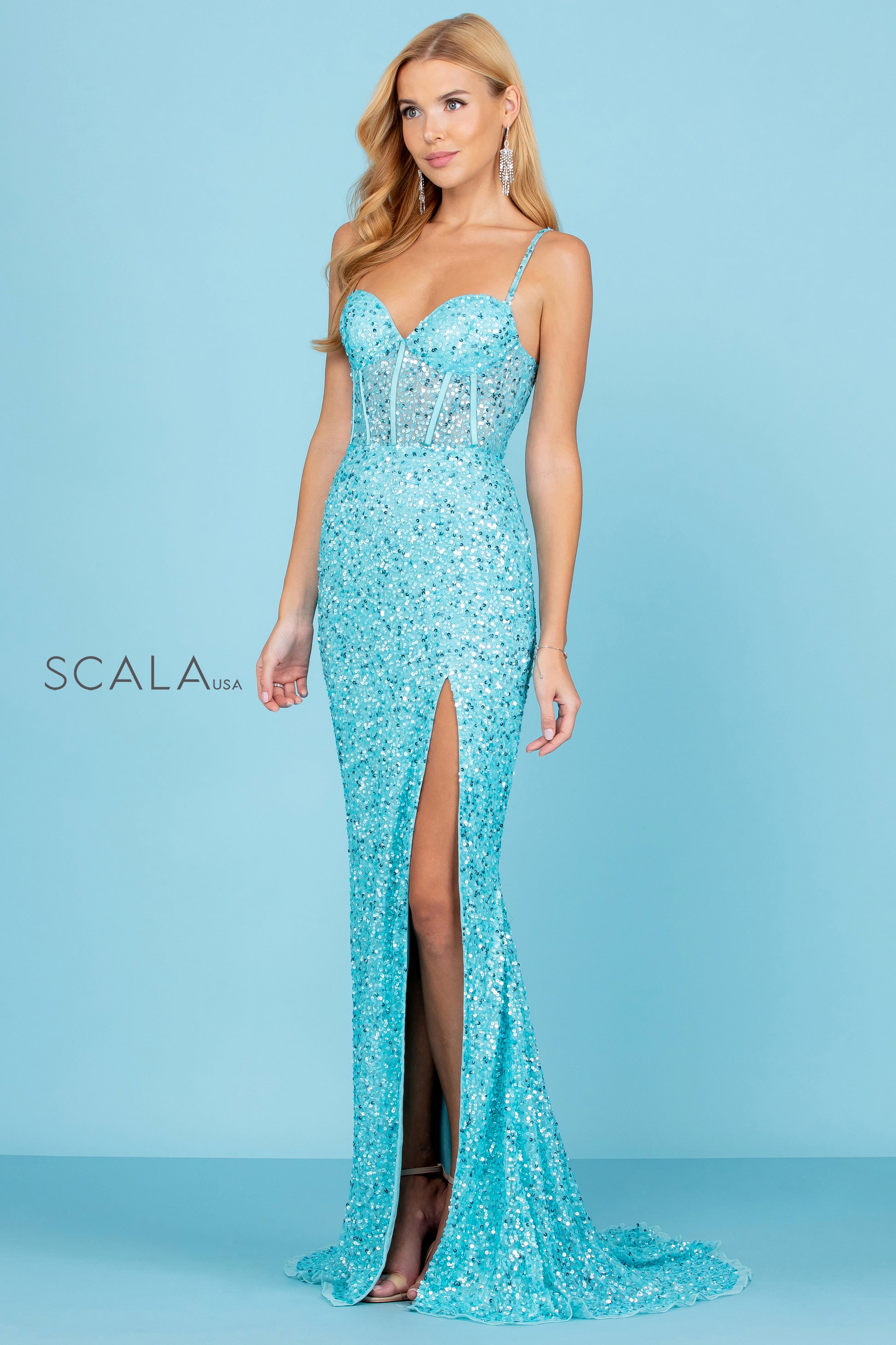 This beautiful sequin gown features a corset bodice. Look fabulous and elegant with this high end material gown that fits like a glove. This SCALA USA gown comes in variety of sizes and colors- lilac, petal, strawberry, red, and turquoise. Need help looking for the perfect size? Contact a stylist today and we will help you find the perfect fit!
