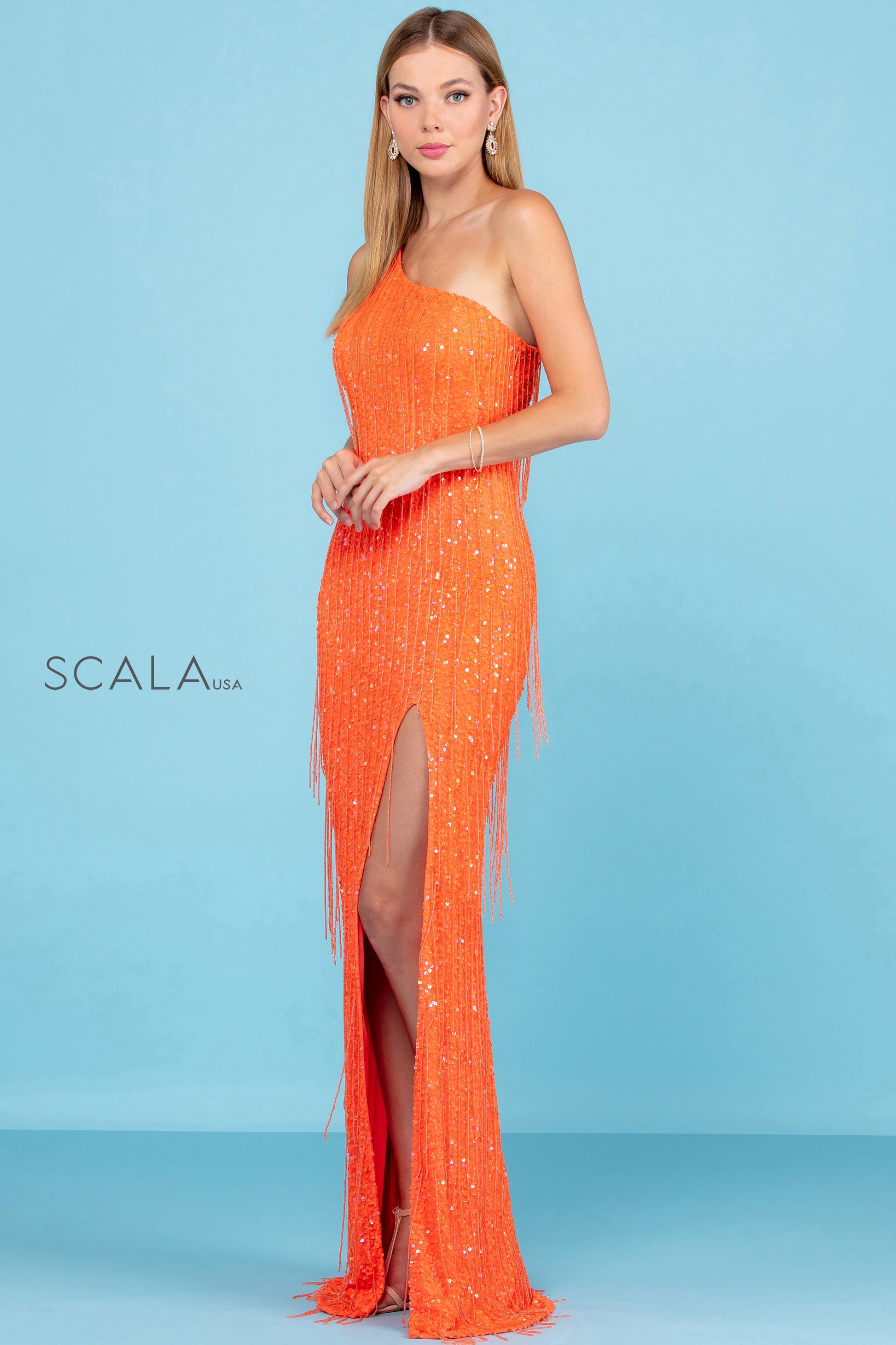 This super elegant one shoulder gown will have heads turning because of how exquisite this look on you! Featuring fringes all over the dress and a high slit, this handmade gown will be the star of the night. This SCALA USA gown comes in variety of sizes and colors- dolphin, grape, orange, and strawberry. Need help looking for the perfect size? Contact a stylist today and we will help you find the perfect fit!
