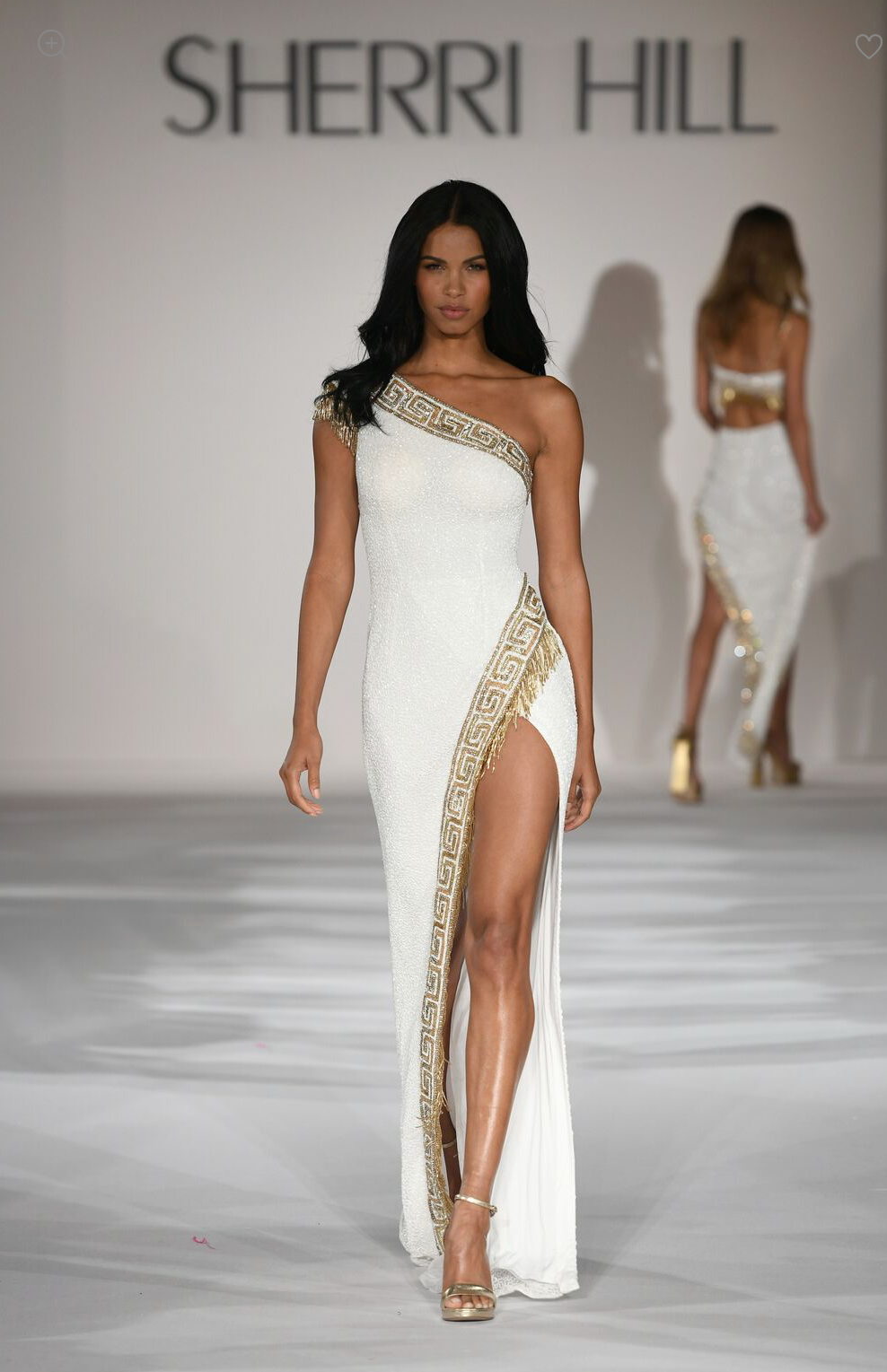 One shoulder fully beaded gown with fringe cap sleeve and fringe high slit skirt.