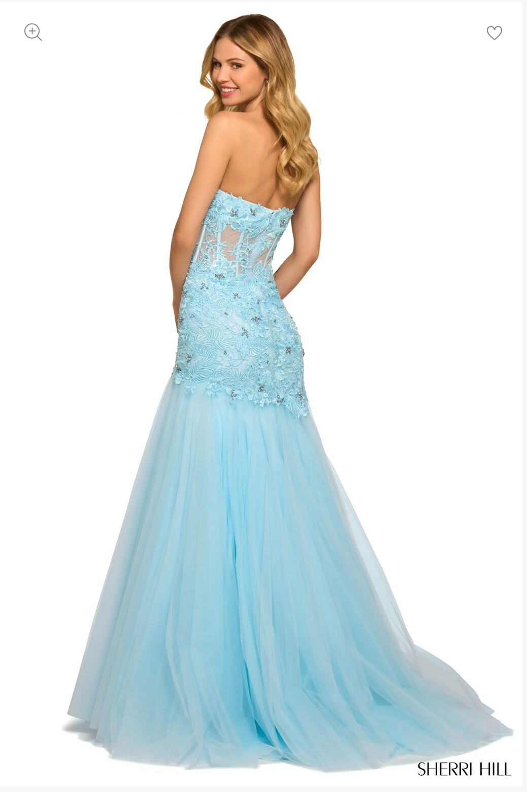 Strapless mermaid gown with corset sheer leaf lace bodice and tulle skirt.