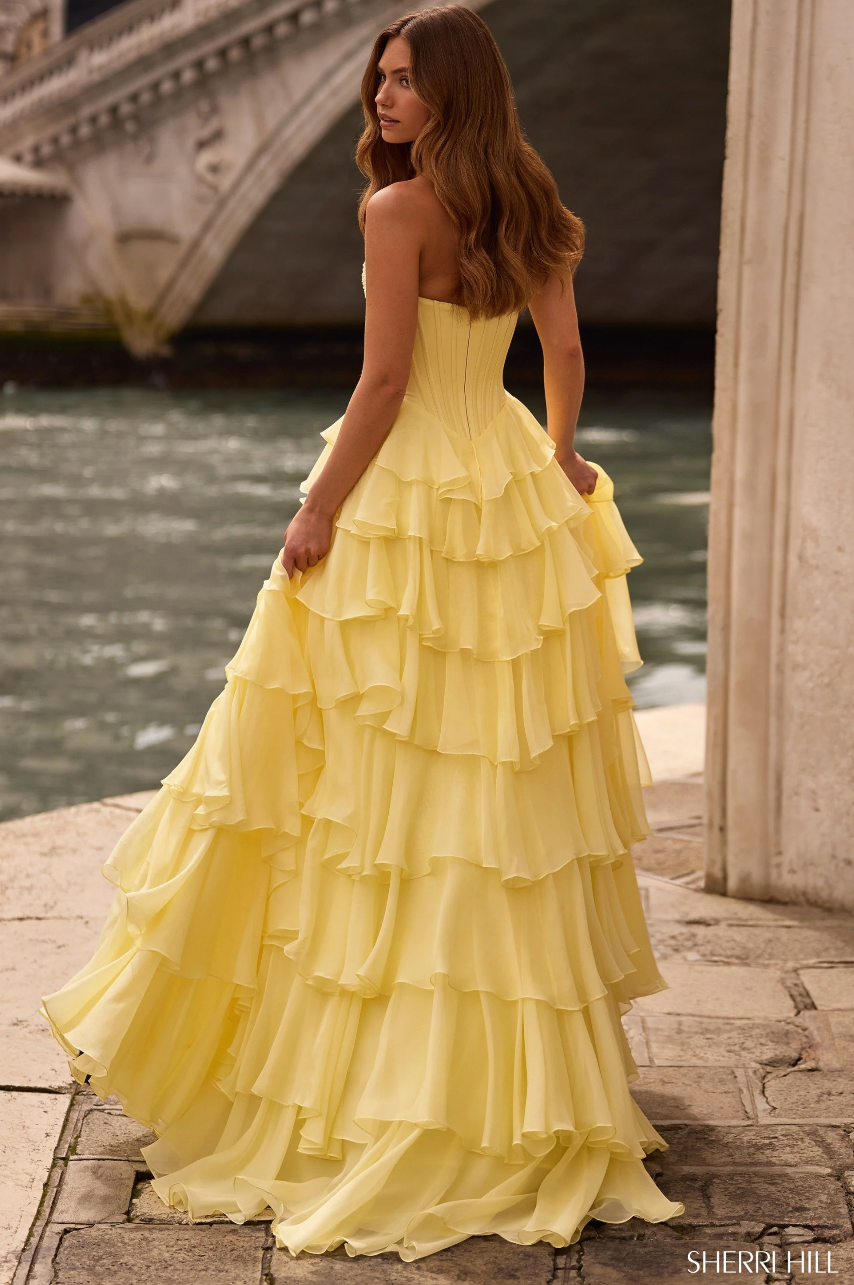 Elevate your formal wardrobe with this stunning strapless gown from Sherri Hill. The structured corset bodice provides a flattering silhouette, while the flowing chiffon ruffle skirt with a daring slit adds movement and sophistication. Available in 17 captivating colors and an extensive size range, this versatile piece transitions seamlessly from prom to pageants to black-tie events. The timeless design ensures you'll make a memorable impression at any occasion.