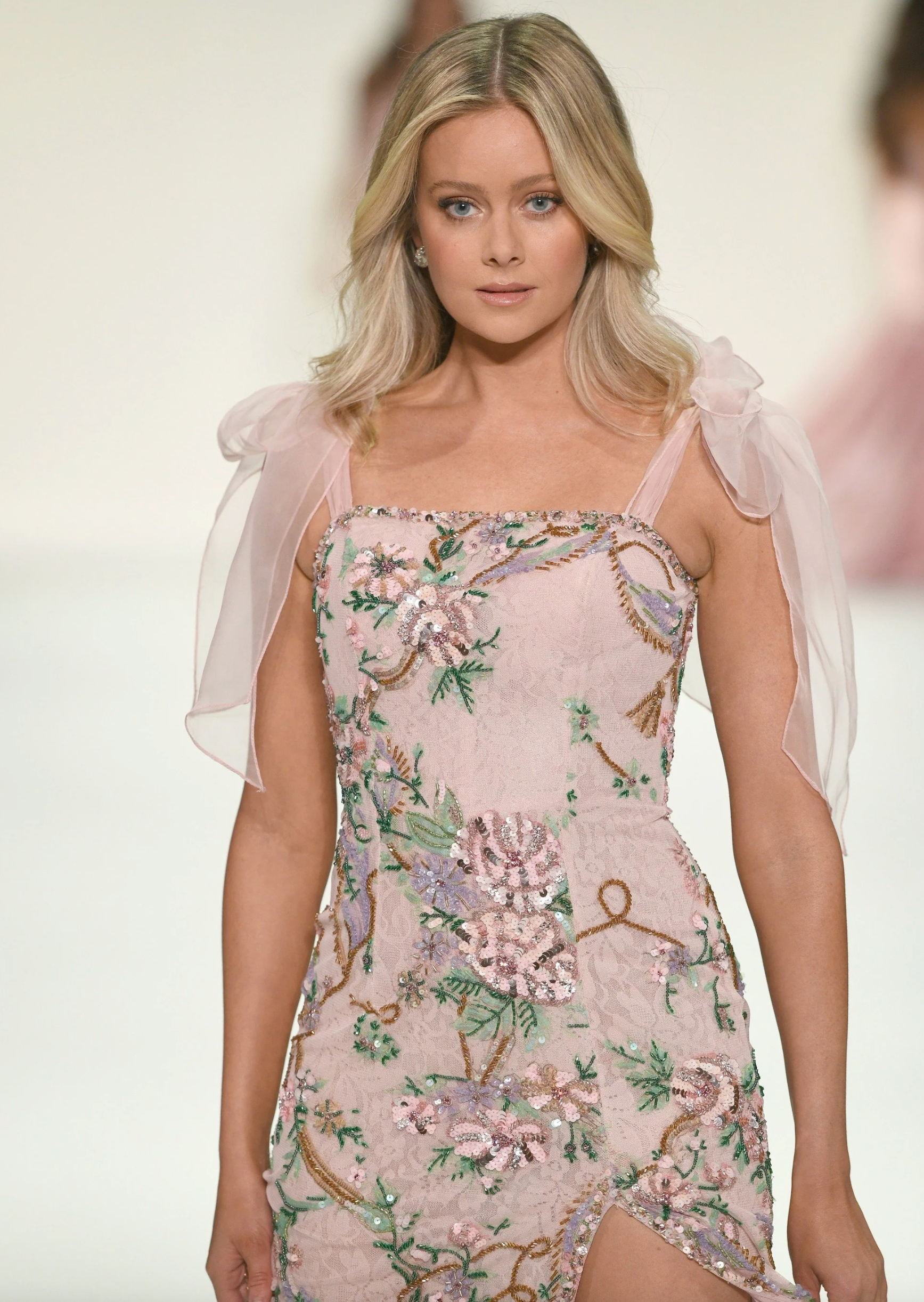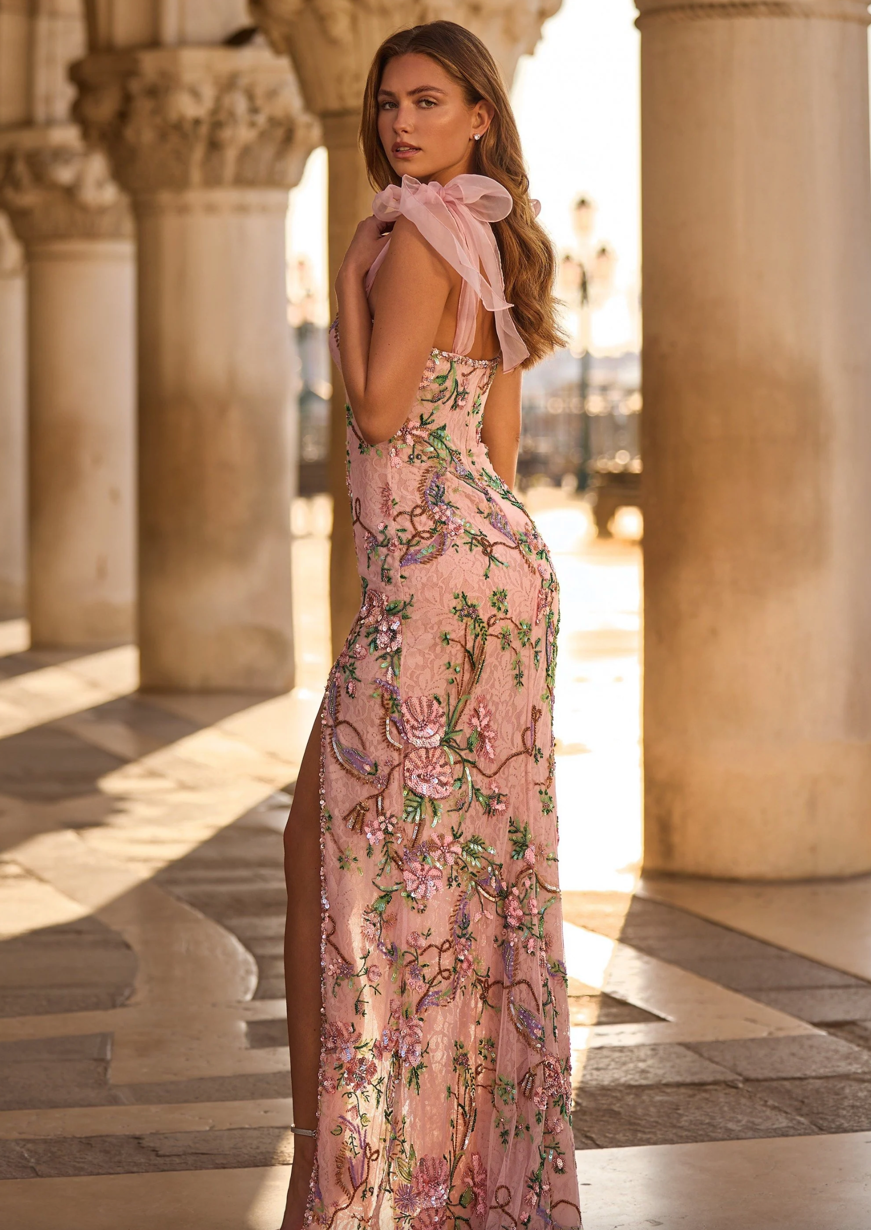 Elevate your formal wardrobe with this exquisite beaded floral gown from Sherri Hill. The fitted silhouette showcases intricate beadwork that catches the light beautifully, while delicate chiffon bows grace the shoulders for an added touch of elegance. A tasteful skirt slit provides movement and modern sophistication. Available in four stunning print options—Ivory, Light Pink, Light Yellow, and Lilac—this gown transitions seamlessly from prom to black-tie events. With sizes ranging from 000 to 14, there's a perfect fit for every body type.